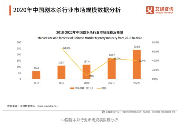 这位大V为了表明对“剧本杀”的支持,抛出了剧本杀市场要超过电影市场的观点。他引用了某第三方机构的数据,剧本杀行业在2020年的117亿营业额,所以按照增速超过电影市场是大概两个事件。