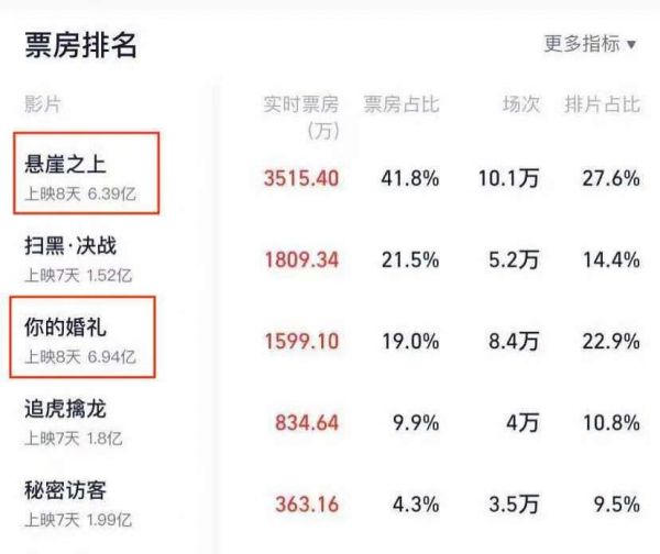从整体数据来看,五一档的表现也是回击了类似的看衰。根据数据统计,五一假期期间,今年五一档最终拿到了16.6亿票房,吸引了4394.41万观众走进影院,票房和观众数量也都是同期最高,单日票房表现最好的分别是,《你的婚礼》以5.09亿票房斩获五一档票房冠军,而张艺谋的《悬崖之上》以5.02亿区居第二,这两部电影也是五一档期最受瞩目的两部热门影片。