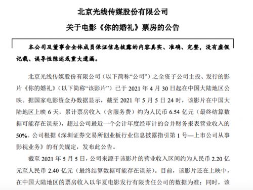 《你的婚礼》的票房走高,也使得该片的出品和发行方获益匪浅。光线传媒发布公告称,截至5月5日,公司源于《你的婚礼》的影业收入区间就是2.20亿至2.40亿,这也为光线传媒的Q2财报提前增光不少。