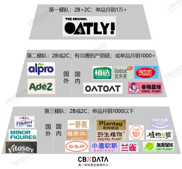 CBNData消费站根据当前品牌的渠道铺设情况和天猫产品销售情况划分了三级品牌梯队。第一梯队仅有OATLY一家,打通了2B、2C两渠道的同时,单品月销量过万。第二梯队的品牌或有大公司产销资源,或销售相对出圈,其中oatoat月销量9000件仅次于OALTY。第三梯队是大多数品牌所属梯队,差异化竞争优势不明显,消费声量也有待提升。