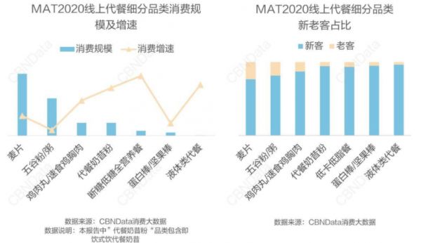 二是燕麦类消费认知基础较好,是具有消费黏性的品类。经过以王饱饱、欧扎克、好麦多为代表的即食麦片热潮后,年轻消费者对燕麦的再加工产品的尝试意愿和接受度都有进一步提升。在线上代餐市场中,麦片已成为消费规模最大、老客消费黏性最高的细分品类。