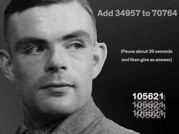 在「计算机器与智能」的一个章节中,图灵模拟了未来智能计算机的测试情况。(人问问题,计算机回答。)