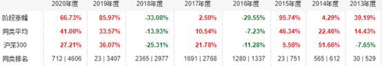 从业绩表现看,天天基金网数据显示,截止4月28日,潘明管理时间最长的国联安优选行业混合基金近一周、近一个月、近一年、近两年的涨幅分别为4.5%、11.65%、27.21%、127.09%。同类基金中的排名分别为241/4511、174/4538、2151/3391、256/2861。从年度表现看,2015、2019、2020年均战胜了沪深300指数,2016、2017、2018年表现逊于沪深300指数。