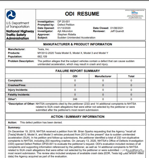 2020年1月13日,NHTSA的下属机构ODI(缺陷调查办公室)开始着手对该请愿书进行调查。