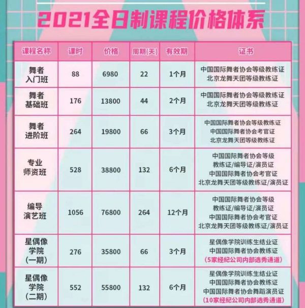 在龙舞天团,练习生根据自身水平参加星偶像学院一期或二期的培训,一期时长3个月,两期时长6个月。一期共276课时,费用是35800元,两期费用是55800元。上述工作人员表示,“我们并不是为了赚你的培训费,而是为了让你红。”其声称,经过公司的培训,80%是能出道的。练习生培训完之后,可以和龙舞签,也可以跟别的公司签。培训结束后,上述工作人员称会给练习生颁发星偶像学院训练生结业证、中国国际舞者协会教练证或舞蹈演员证以及享受5家以上经纪公司内部选秀通道。不过,中新经纬记者在全国社会组织信用信息公示平台查询“中国国际舞者协会”,无任何登记信息,这也就意味着上述协会并未在民政部门正式注册。