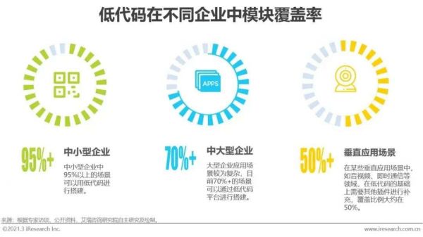 艾瑞报告也显示,中小企业更为偏爱低代码,由于应用复杂度低、业务流程相对简单等原因,95%的应用场景均可用低代码来完成。与此类比,中大型企业中低代码目前可覆盖70%的应用场景