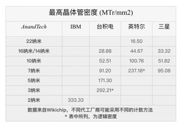 由外媒整理的晶体管密度对比参考