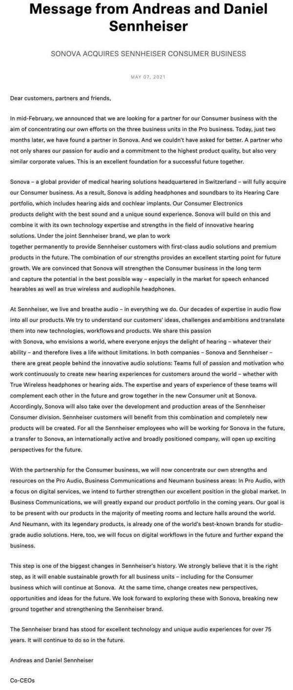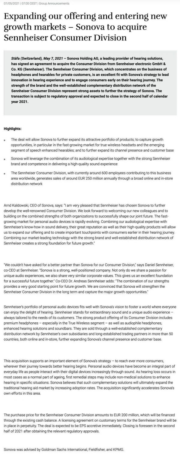 ▲Sonova收购森海塞尔消费者业务部门官方声明