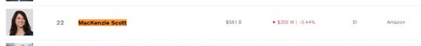 麦肯齐在获得巨额的离婚财产后,身家飙升。根据《福布斯》实时富豪排行,麦肯齐目前位列第22位,身家581亿美元,是全球第三大女性富豪,仅次于来自欧莱雅的弗朗索瓦丝·贝当古·迈耶斯及家族和沃尔玛创始人山姆·沃尔顿的独生女艾丽斯·沃尔顿。