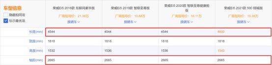 比如上汽荣威的畅销车型Ei5,从2018年到2021年,经历三次升级改款,其中前两次车身长度都没比,均为4544毫米,而2021年3月最新的这次升级呢,长度恰好4600毫米,关键是在长度加了56毫米的同时,代表车内空间大小的轴距竟然保持不变,加了长度,却没加空间,这操作耐人寻味。