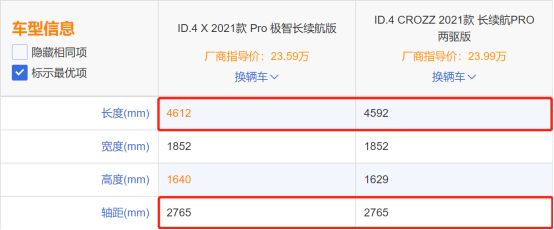 然后还有最近热度颇高的一汽大众和上汽大众的ID.4系列,上汽大众的ID.4 X车长4612毫米,一汽大众的ID.4 Crozz车长4592毫米,比4.6米少了8毫米,而轴距两车完全一样。