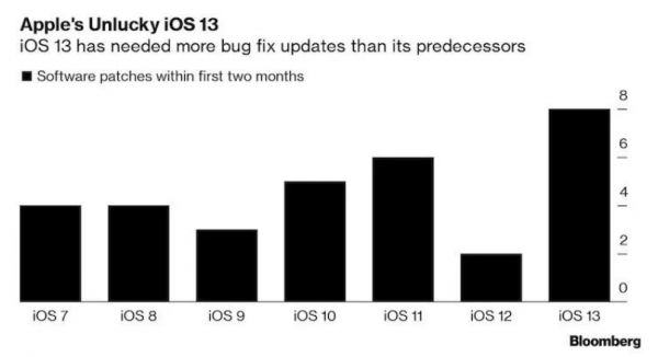 然而好景不长,消费者只体验了一年的“流畅稳定”,iOS 13竟让他们“重温噩梦”。Bloomberg统计了苹果历代系统发布后两个月内推送修复补丁的频率,iOS 13毫无争议地夺得第一,直观地展示了iOS 13作为“史上第一多BUG iOS”的实力。