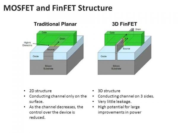 讲得通俗易懂点,就是传统的FET(场效应管)属于平面架构,只能控制一侧的电路,而FinFET则是3D立体架构,可以同时控制两侧电路。