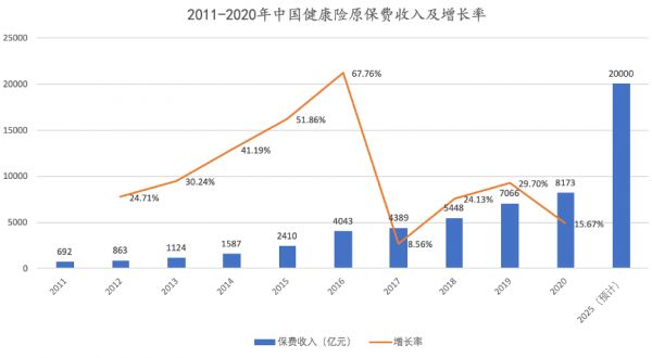 据2019年12月份银保监会等13部委联合发布的《关于促进社会服务领域商业保险发展的意见》:“力争到2025年,健康险市场规模超过2万亿元。”也就是说,至少还有3倍的市场空间。