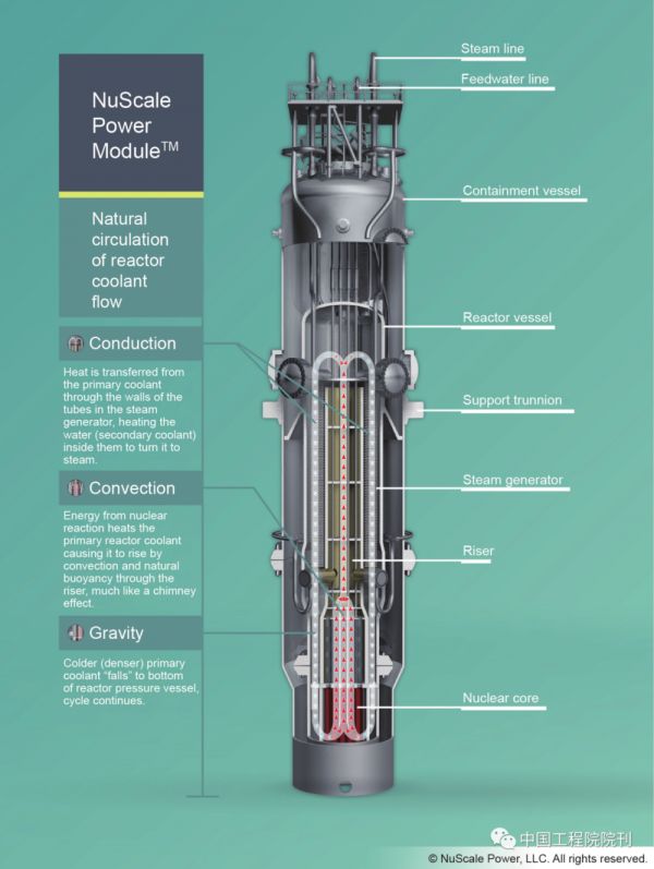 图2 NuScale公司的SMR依靠被动水循环来冷却堆芯。随着堆芯中的水越来越热,核反应堆的密度变得越来越小,并且开始从堆芯中升起来。这些水将核反应堆的部分热量传递给蒸汽发生器中的水,然后堆芯开始冷却,同时它的密度变得越来越大,最终沉到堆芯底部并开始循环。图片来源:NuScale,Wikimedia Commons(CC BY-SA 3.0)