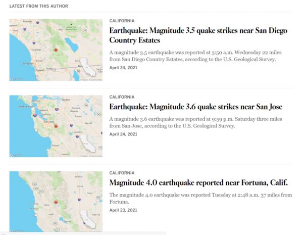 Quakebot近期发布的新闻。图片来源:《洛杉矶时报》