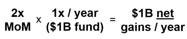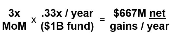 假如你筹了一笔10亿美元的基金,每年打算投其中的1/3(按3年的部署时间表计算),而且你给一篮子投资设定标准的3倍退出,那你每年的资本收益就是: