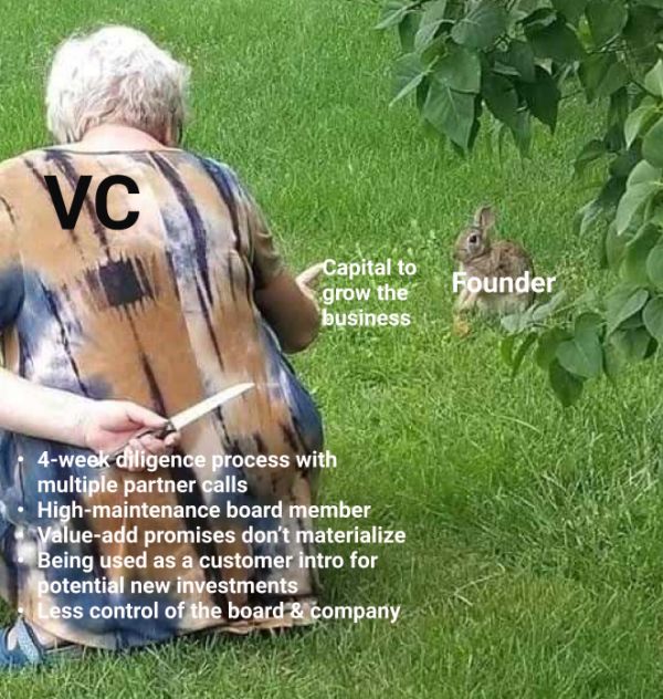 乍一看,这似乎还不算太糟糕!当然了,除非所讨论的公司缺乏(如大多数情况一样)不能有力地传递市场/品牌信号(大部分都是),否则它们就提供不了增值(通常如此),而且董事会成员对董事会/业务的影响是中性甚至是破坏性的(这种情况比应当的情形要更普遍)。这个就是老虎可以利用上的第二个落伍的(且错误的)常态/说法——大多数风险/增长产品宣贯的核心都是围绕着自己这家基金能够为初创企业提供哪些增值服务而展开的,但实际上基金能提供的价值寥寥无几。实际上,我认为在很多创始人看来,典型的VC产品可能会是像这样的: