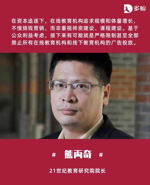 此次,熊丙奇接受多鲸专访,明确表示反对教育行业无节制、过度的广告投放行为,认为在线教育的规模化扩张会助长教育焦虑的蔓延、恶化教育生态,他预判线上线下教育机构的广告投放将会被严格限制甚至全面禁止,因此主张提供小而美、差异化的教育服务,建设基于科学教育价值观的教育生态。
