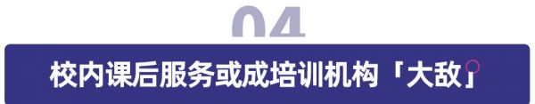 为了给“培训热”降温,现在学校管理上有一些招数,这些招数对培训机构才是真正致命的。以课后服务全覆盖为例,要求所有义务教育学校提供课后服务,初中学校可开晚自修,部分学校双休日提供周末服务。当校内的高质量课后服务体系建立起来后,可能会减少家长对校外培训的依赖。