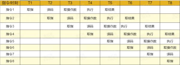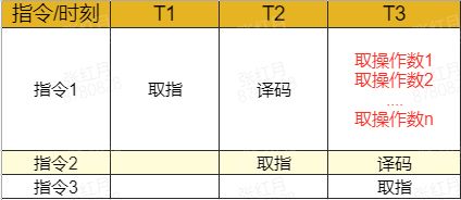 为了缩短指令执行的晶体震荡周期,芯片设计人员参考了工厂流水线机制的提出了指令流水线的想法。由于取指、译码这些模块其实在芯片内部都是独立的,完全可以在同一时刻并发执行,那么只要将多条指令的不同步骤放在同一时刻执行,比如指令 1 取指,指令 2 译码,指令 3 取操作数等等,就可以大幅提高 CPU 执行效率:
