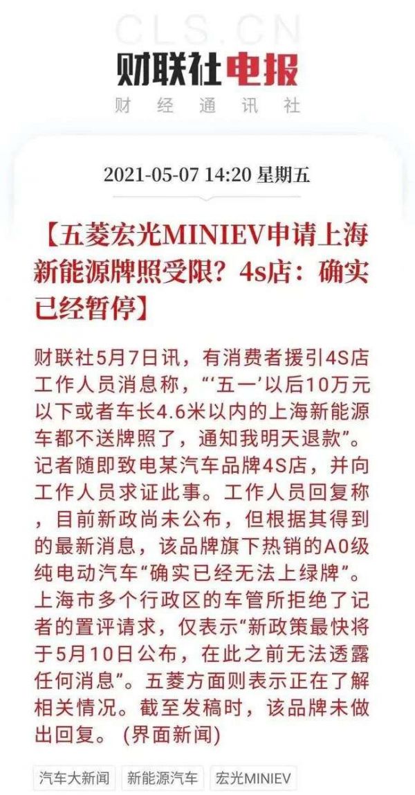 上周五,据财联社援引一位五菱宏光MINI EV经销商销售人员消息表示,“政策发布后,10万元以下或者车长4.6米以内的上海新能源车都不送牌照了,已通知我明天向车主退款。”