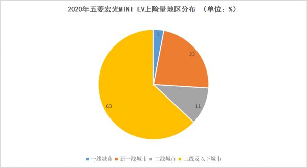 根据五菱汽车发布的五菱宏光MINI EV去年销量分布情况来看,其销量主要集中于三线以下城市,占比为63%,而像上海、北京等一线城市的比例仅为3%。再看今年第一季度的上险量,上海地区五菱宏光MINIEV的上险数为1509辆,仅占该车型全部上险数的2%。