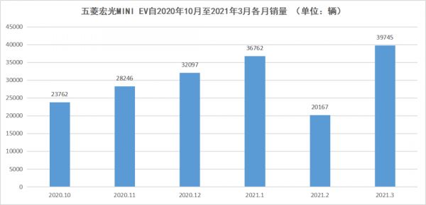 今年2月由于春节假期的影响,全行业销量有所下滑,五菱宏光MINI EV也不例外,销量下滑至20167辆,但3月的销量为39745辆,相较于1月销量仅增长了8.1%。