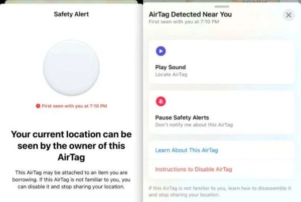 布伦达在对AirTag的“保护措施”进行测试时发现,如果用户身上被放置了来路不明的AirTag,他们的iPhone上将会收到一个安全警告:“AirTag的主人可以看到你当前的位置”,并提供该AirTag的详细信息,用户也可以手动解除连接。