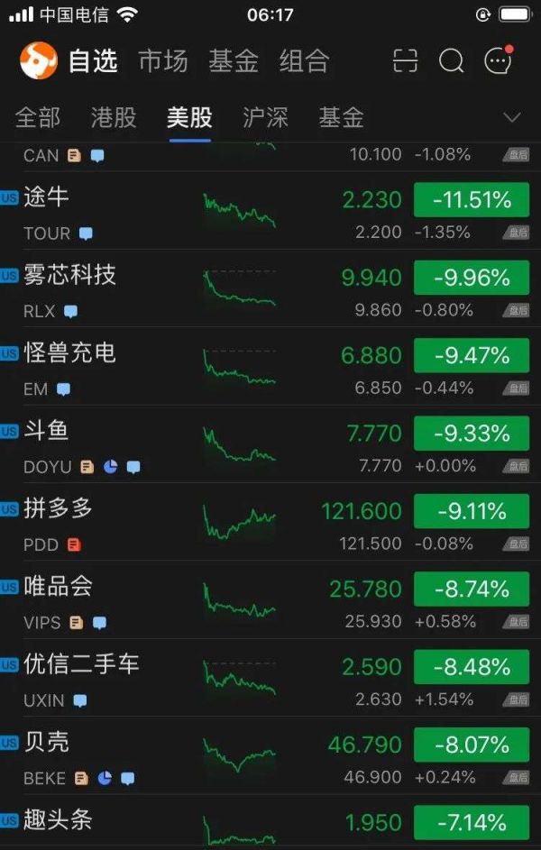 拼多多跌9.22%,美团ADR跌11.18%,此前上海市消保委就消费者权益保护方面问题约谈拼多多、美团。