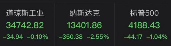 截至收盘,道指跌34.94点,报34742.82点,跌幅为0.1%;纳指跌350.38点,报13401.86点,跌幅为2.55%;标普500指数跌44.16点,报4188.44点,跌幅为1.04%。