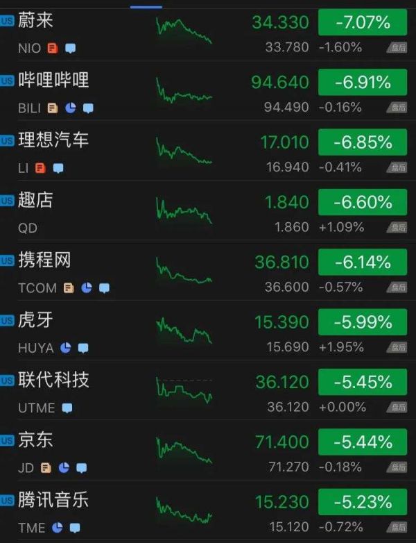 中概股全线重挫,知名中概股中阿里巴巴跌2.57%;百度跌4.23%;腾讯ADR跌超4%;京东跌5.46%;网易跌3.94%;蔚来跌7.08%;虎牙跌5.99%;哔哩哔哩跌6.91%;贝壳跌8.15%;洋葱跌17.27%;水滴跌12.08%。