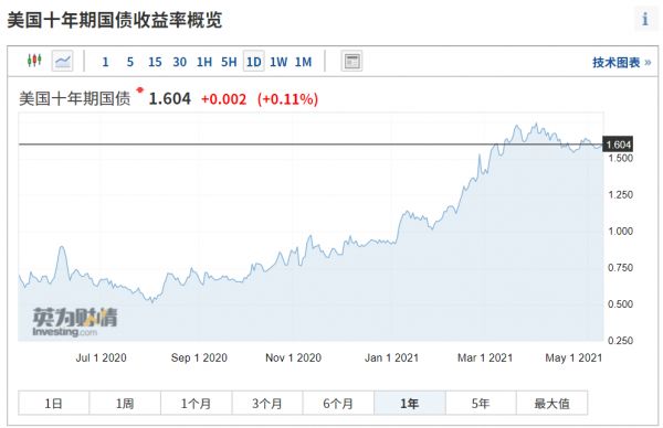 到美股收盘时,10年期美债收益率约为1.60%,日内升约2个基点,为4月29日以来收盘时最大升幅。