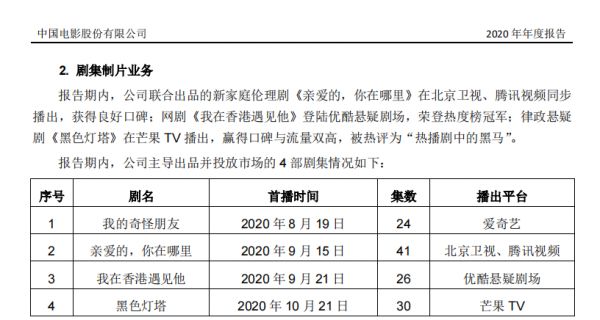 即使是在国字头的中国电影的年报中,这种趋势也在蔓延。如果说2019年还是以台网同步剧为主,2020年播出剧集则几乎全部在视频平台。年报显示,除联合出品的新家庭伦理剧《亲爱的,你在哪里》在北京卫视、腾讯视频同步播出;网剧《我在香港遇见他》登陆优酷悬疑剧场;律政悬疑剧《黑色灯塔》在芒果 TV 播出。