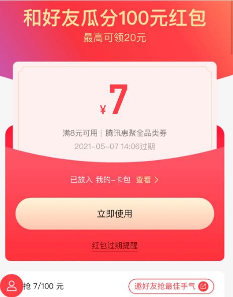 网友在裂变红包中拿到了满8元减7元的购物红包