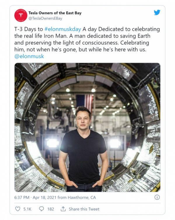根据福克斯商业的报道,马斯克的粉丝将 4 月 20 日设定为“伊隆·马斯克日”,以此庆祝马斯克给他们带来的提升,尽管这没得到马斯克本人的认同,这个信息已经在许多特斯拉车友会上得到传递。