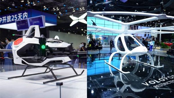 左为小鹏汇天的第四代智能电动载人飞行器旅航者X1,右为德国飞行汽车公司E-VOLO的产品Volocopter