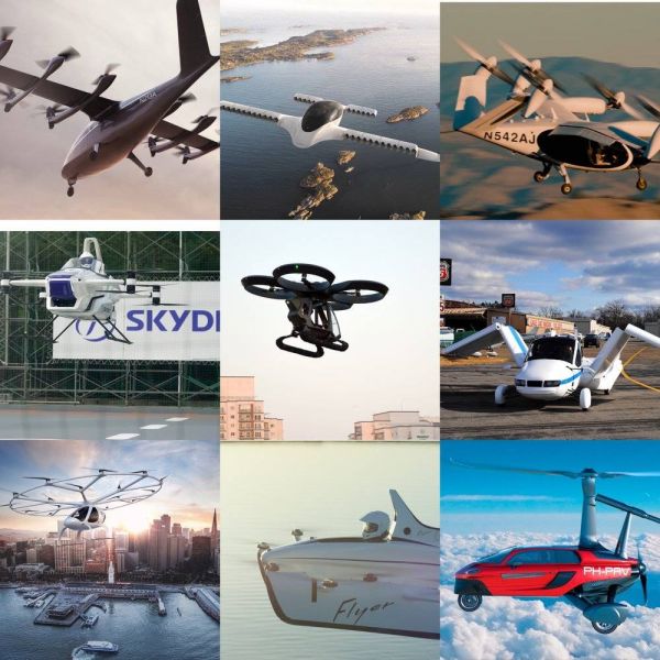 目前进入试飞阶段的飞行汽车产品,他们的构型目前还没有统一的标准。从左到右分别为:美国Archer的飞行器、德国Lilium的飞行器、美国Joby Aviation的飞行器、日本SkyDrive的飞行器、土耳其Baykar的飞行器、吉利收购的Terrafugia的飞行汽车、德国的Volocopter、拉里·佩奇投资的Kitty Hawk飞行器、荷兰PAL-V的飞行汽车。
