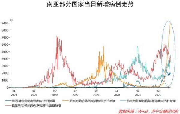尽管欧美、中东、南亚的很多国家都已针对印度采取了暂停航班、限制相关人员入境等措施,但快速蔓延的疫情还是外溢到了其他国家。其中,泰国、尼泊尔、马来西亚、巴基斯坦等数个周边国家的病例增长速度大幅度攀升,尤其是尼泊尔,短短几天就新增病例数万人,当日新增确诊病例数已连续多日维持在8000~9000人,大有成为第二个印度之势(见下图)。