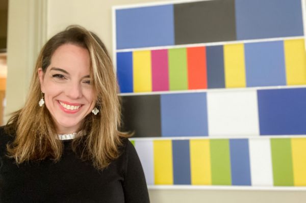 伯纳黛特·谢里丹站在她家人名字对应的色彩图画旁,从上到下依次为:Tom,Bernadette,Otis,Clementine。