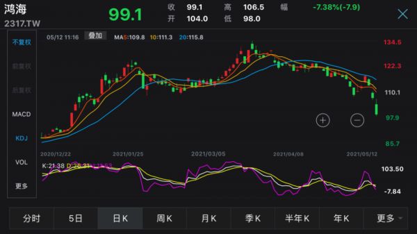 或受此消息影响,富士康母公司鸿海股价在5月11日暴跌超5%,12日鸿海股价低开低走,截至发稿,跌7.38%,每股报99.1新台币,总市值1.37万亿新台币。而这已经是鸿海股价连续三天大跌,三天时间内鸿海市值蒸发新台币2564亿,约合人民币592.5亿元。