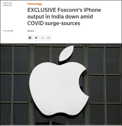 据环球时报报道,路透社消息称,由于印度疫情持续蔓延,富士康在印度的工厂出现大规模感染,目前工厂负责加工的iPhone手机已经减产超过50%。