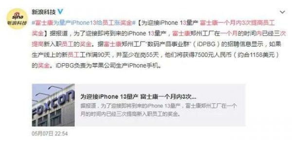 印度减产,但苹果手机还是要出的,为了迎接即将到来的 iPhone 13量产,富士康郑州工厂在一个月的时间内已经三次提高新入职员工的奖金。