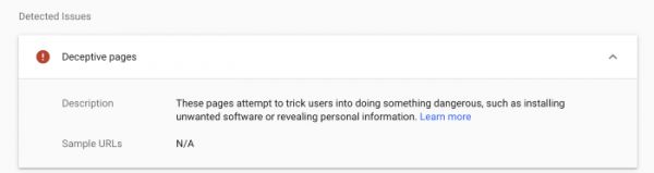 当我们的DevOps团队在全员应急模式下工作,以建立一个新的CDN,并准备将客户转移到一个新的域名上时,我发现谷歌的文档声称GSB提供了额外的解释,说明为什么一个网站在违规网站的谷歌搜索控制台(GSC)中被标记。但为了访问这些信息,你必须在GSC中宣称对该网站的所有权,这需要你设置一个自定义的DNS记录,或者将一些文件上传到违规域名。我们争分夺秒地做着这一切,20分钟后,成功地找到了关于我们网站的报告。