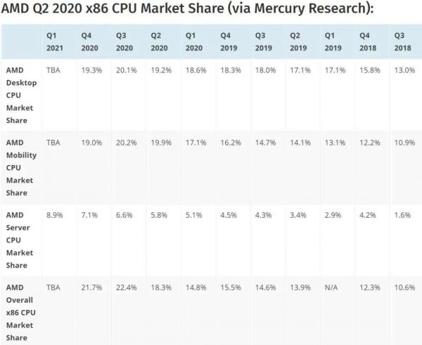 来自调研机构 Mercury Research 最近的一份报告显示,在 2020 年四季度全部 x86 CPU 的市场中,AMD 的桌面产品占比 19.3%,移动平台占比 19.0%,总体市场占有率在 2020 年末为 21.7%。