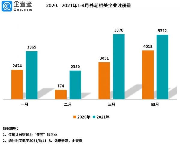 企查查数据显示,2021年1-4月,我国共新增1.7万家养老相关企业,同比增长65.5%。其中一月注册量达3965家,同比增长63.6%。二月新注册2350家,同比增长203.6%。三、四月注册量分别为5370家、5322家,均呈同比增长趋势。