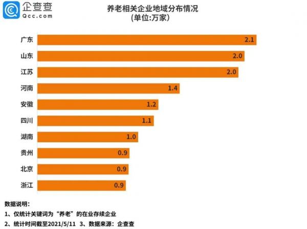从地区分布来看,企查查数据显示,广东是我国养老相关企业数量最多的省份,目前总数量达到2.1万家,山东、江苏分别以2.02万家、1.96万家紧随其后。此外,河南、安徽、四川、湖南等省份也同样超过了1万家。