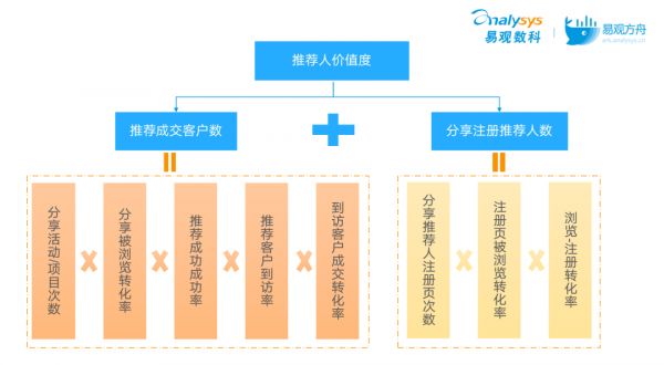 我们可以将推荐人价值度拆分为两个指标:推荐成交客户数和分享注册推荐人数。再进一步细分这两个指标,便可以形成一套初步的、评估推荐人价值度的指标体系。
