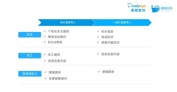 例如,针对高价值推荐人的车主,提供个性化车主服务、尊贵活动邀约等;针对一般价值推荐人提供一定的增值服务等。