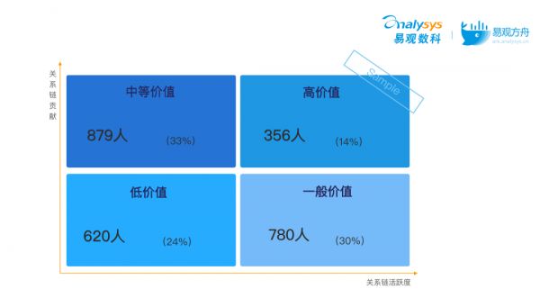 搭建完指标体系后,我们即可根据 “关系链活跃度-关系链贡献度”这两个指标,建立波士顿矩阵,将推荐人划分为四类群体,进行推荐人贡献的分群管理。